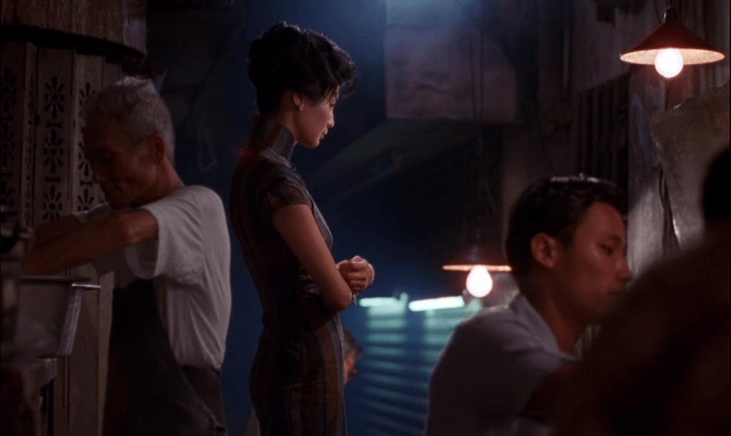 The theme was composed by Japanese musician Shigeru Umebayashi, who would also go on to score Wong’s near-sequel to Mood, 2046 (2004). The score was originally for another film, Seijun Suzuki’s Yumeji (1991). It’s haunting minimalism painfully counterpoints with the dingy, narrow backstreets being navigated by Maggie Cheung, dressed regally in colorful qipao, who’s out to buy noodles. The music, with its claustrophobic repetition, its frustrating and heavy-hearted unresolved highlights the choking, repetitive solitude that the film’s primary characters (the handsome Tony Leung Chiu-wai as Maggie Cheung’s neighbor and not-quite partner) have been condemned into by their corresponding spouses’ infidelity.