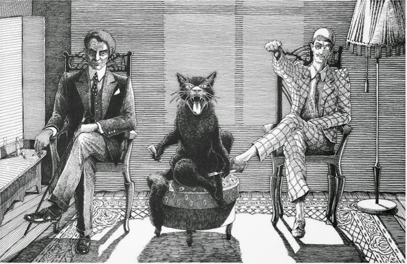 It turns out that the Devil has other tricks up his sleeve. Accompanied by Koroviev, his equally malevolent stage hand, and Behemoth, a cat the size of a hog who can talk, walk upright, and at times even take the form of a human, he contrives to put up a show of black magic before the Russian public. Those who become suspicious of his acts are met with increasingly maddening fates (one gets framed before the police for speculating in foreign currency, one gets teleported to Yalta in his underwear, and another goes crazy after getting his head torn off and replaced by Behemoth in the middle of a live performance).