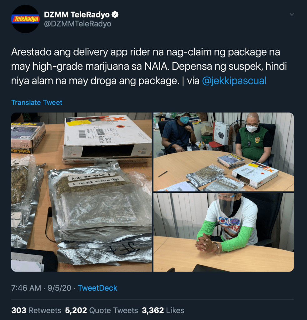 Reading this is just absolutely painful for me. The rider is clearly seen in the photo to be in handcuffs. He has taken the fall for something he absolutely had no hand in. Delivery riders don’t open the packages. They are not equipped with devices to sniff out illegal contents. They pick up the package, find the address on the waybill, and then drop it off to whomever it belongs. Transaction complete. Time for the next one. The report on the DZMM says that the rider’s defense was that they didn’t know the package had any illegal contents. No shit. That’s not an excuse; that’s a job description.