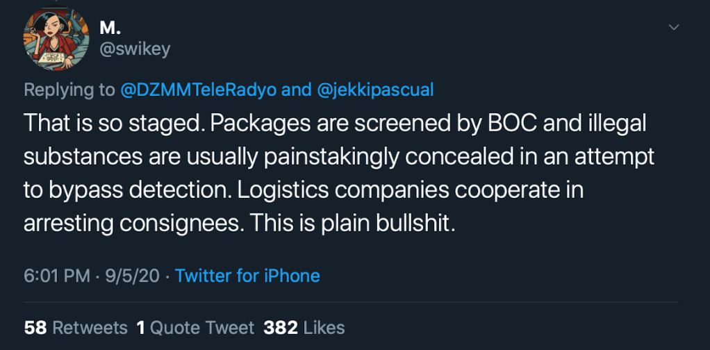 Apparently this is the department that has been appointed by Duterte (the PDEA works under the supervision of the Office of the President) to protect the public in his war against drugs. I’ve never been a supporter of what I’ve always seen as the highly unscientific, band-aid solutions taken on this war effort (if anything, really a foreshadowing of the unscientific, band-aid solutions being taken on the other war they’ve been fighting against COVID-19), this isn’t in any way changing my opinion on the matter. It’s not convincing anyone else either, except maybe for the trolls who I’m sure would be picking up their scripts in no time.