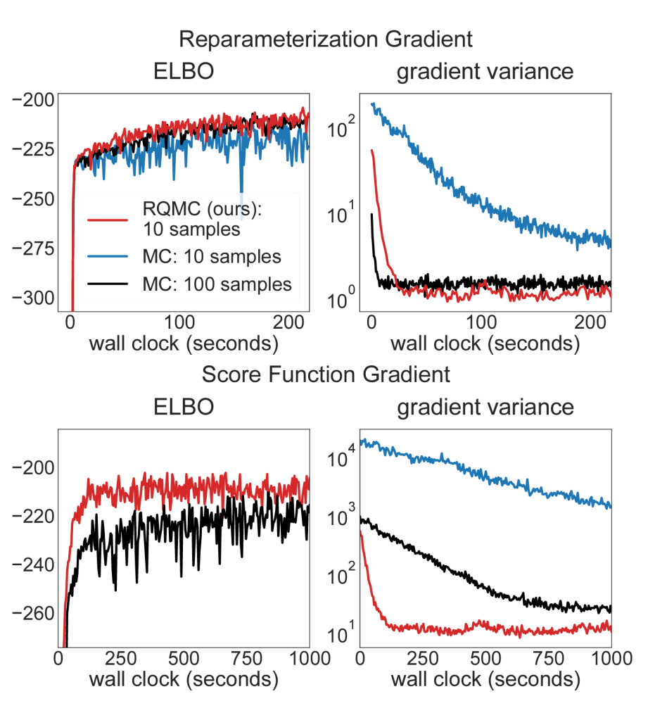 This estimator is very noisy and in fact if left uncontrolled has a tendency to not converge at all. The original authors of the algorithm controlled this by Rao-Blackwellization, while another paper that recently came out proposed an alternative means by applying Quasi-Monte Carlo (QMCVI) sampling such as the Halton or Scrambled Sobol sequences to directly regulate the behavior of the resulting samples. An interesting consequence of this is that the method is that it has become reasonably controlled now such that even samples of size can be used (whereas the original version typically requires about
