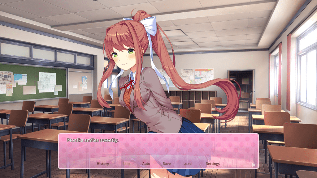In Doki, you play as the male main character who’s been invited by his childhood friend and archetypal genki girl Sayori to join her literature club after school. You join, and in the club meet the other three members: the class president and honor student Monika, manga and pastry loving tsundere Natsuki, and the timid and shy yandere Yuri. It’s deceptively designed to look, feel, and even sound like a regular anime dating game, but as the characters begin to grow out of their stereotypes, the game itself starts to take on an uncanny connection with reality.